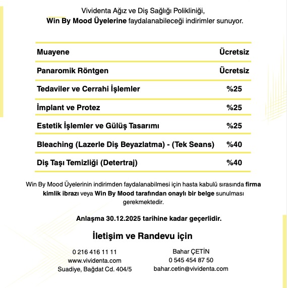 Vividenta Ağız ve Diş Sağlığı Kliniği (www.vividenta.com ) ile, Winbymood üye firmaların çalışanları ve birinci derece yakınlarının, Vividenta Ağız ve Diş Sağlığı Polikliniğin’ den alacakları muayene ve tedavi hizmetlerinde geçerli liste fiyatları üzerinden %20 oranında indirimden faydalanacaktır.